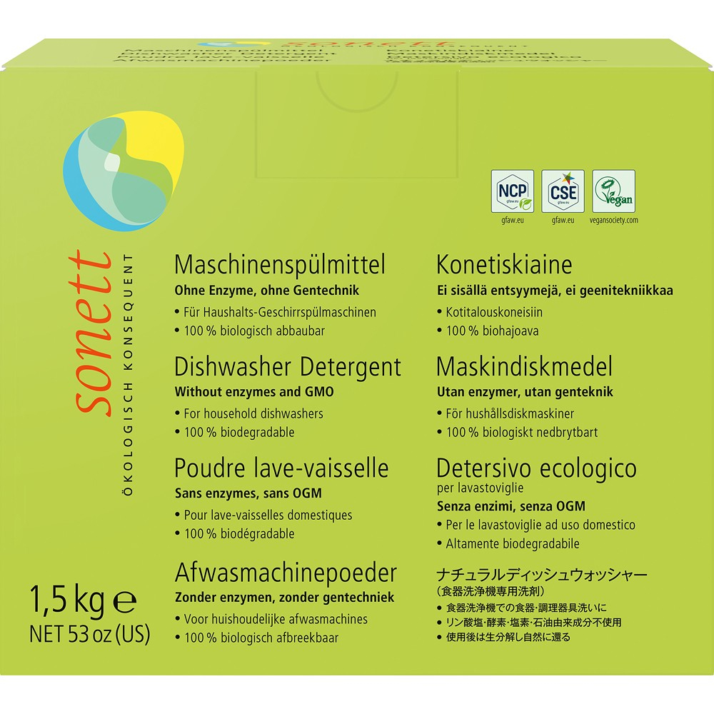 Ingrediente: > 30% silicati, >30% citrat, 5-15% percarbonat de sodiu, inalbitor pe baza de oxigen, indeparteaza petele de cafea si ceai, 5-15% soda, silicati si soda dizolva petele de amidon, proteine si grasimile emulsifiate. Citratul leaga resturile de calcar si impiedica depunerea acestuia pe vesela si pe structura masinii.