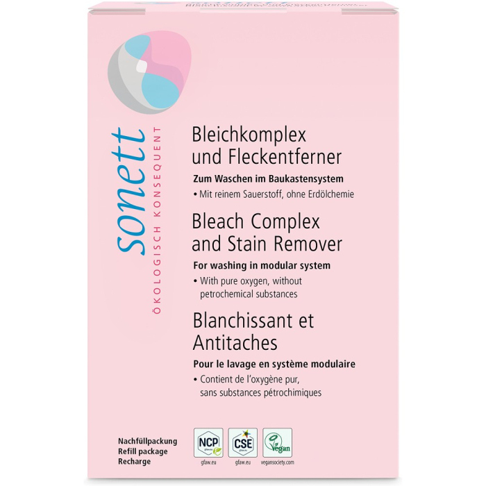 Complex de albire Sonett si indepartare a petelor functioneaza cu oxigen pur de la 50° C. Daca inalbitorul poate functiona mai mult timp, de ex. peste noapte, functioneaza de la 30° C. Pentru toate textilele lavabile, albe si colorate, din bumbac, in, canepa si tesaturi mixte. Atentie: Nu este potrivit pentru lana, matase, raion si microfibre.