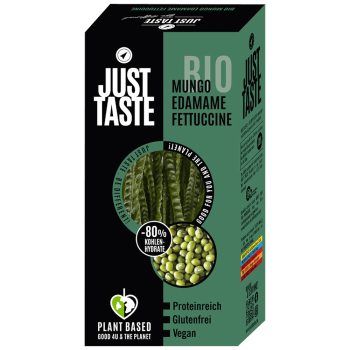 Aceasta reteta a fost conceputa pe baza puterii activa a boabelor de edamame si a fasolei mung. Astfel s-a reusit conceperea unui produs excelent din punct de vedere a valorii nutritionale. Pastele de la JustTaste se preteaza cu precadere pentru a fi rafinate cu un sos delicat. Culoarea verde a pastelor transforma orice farfurie in una de eveniment.